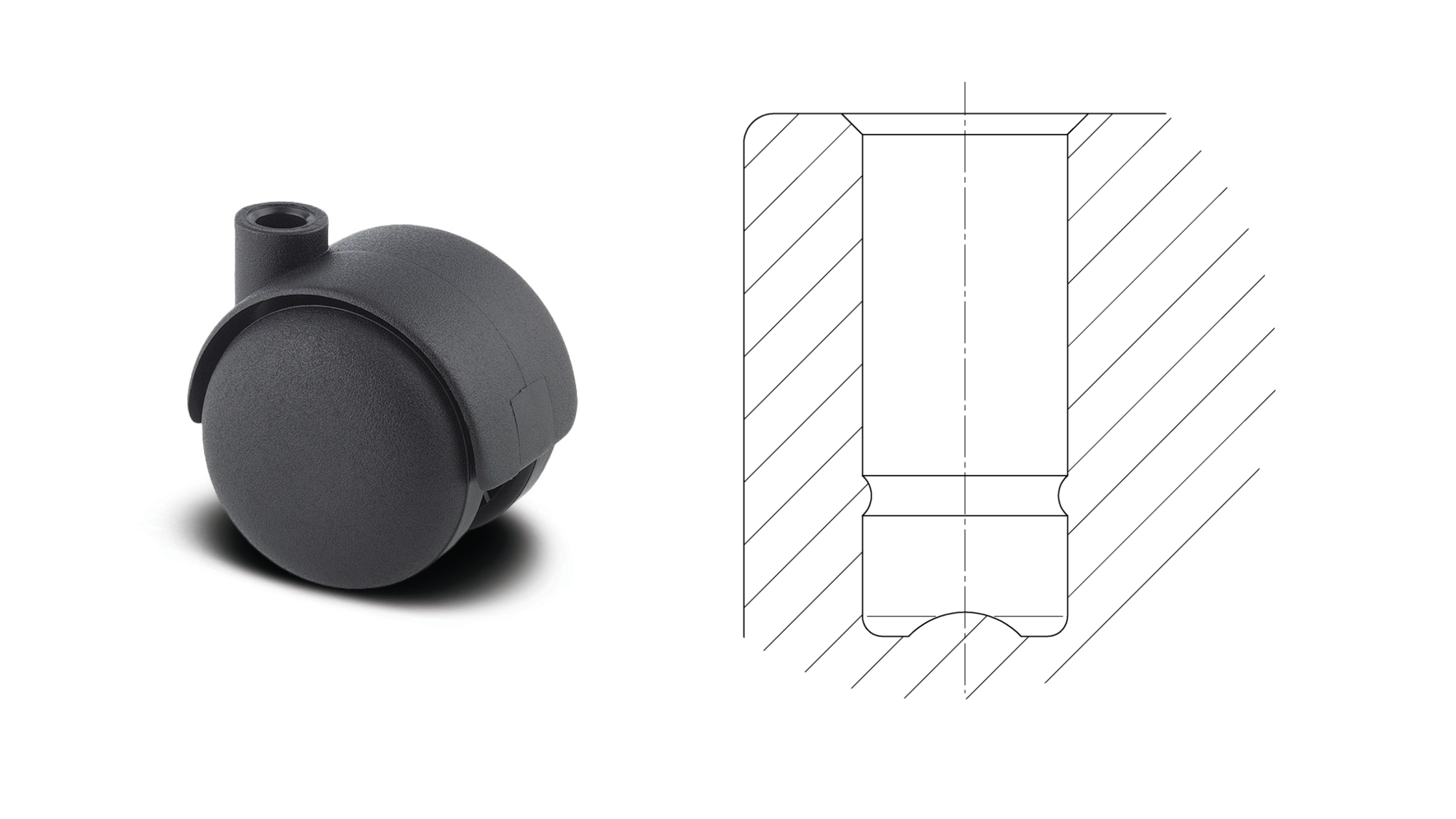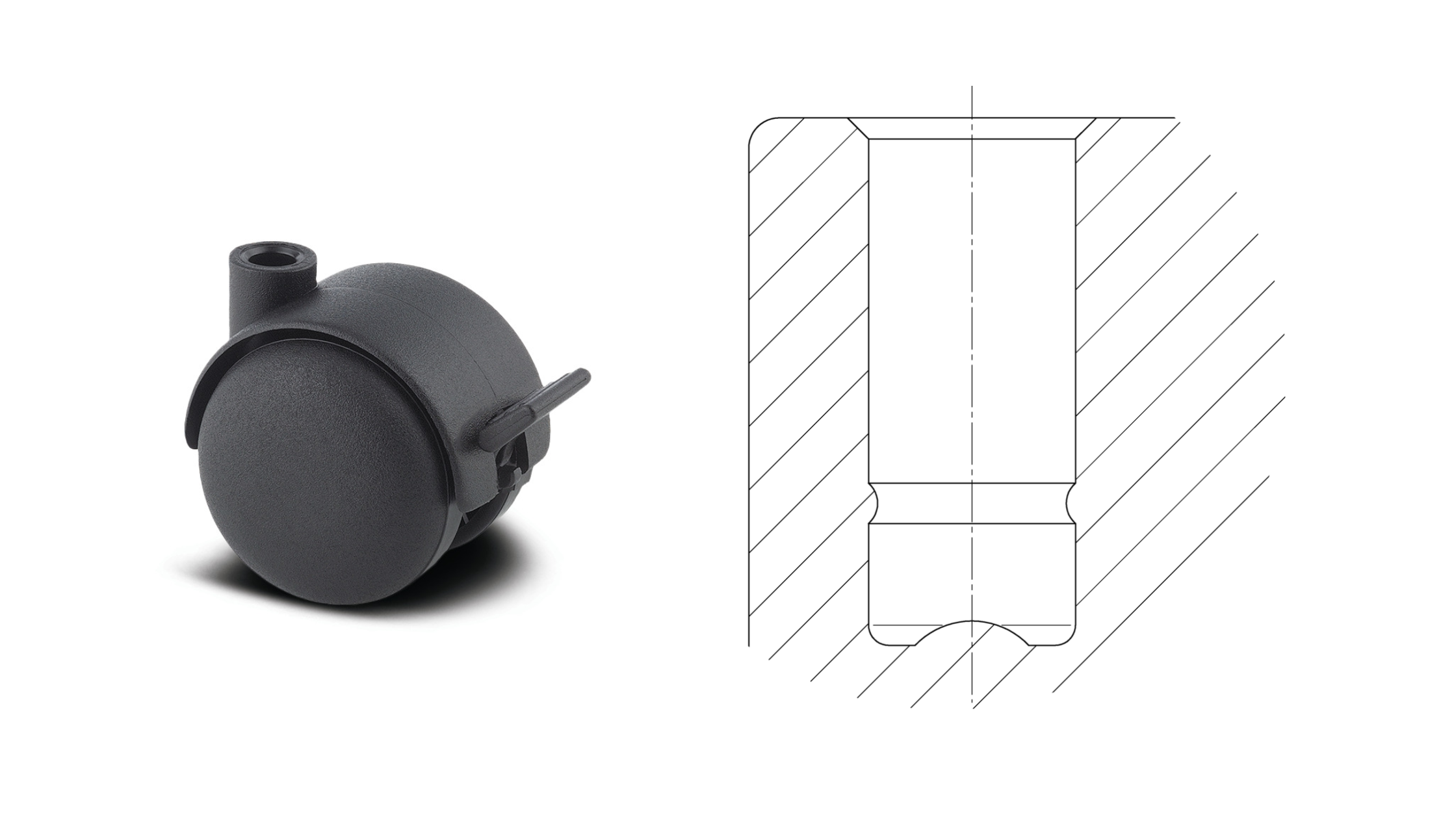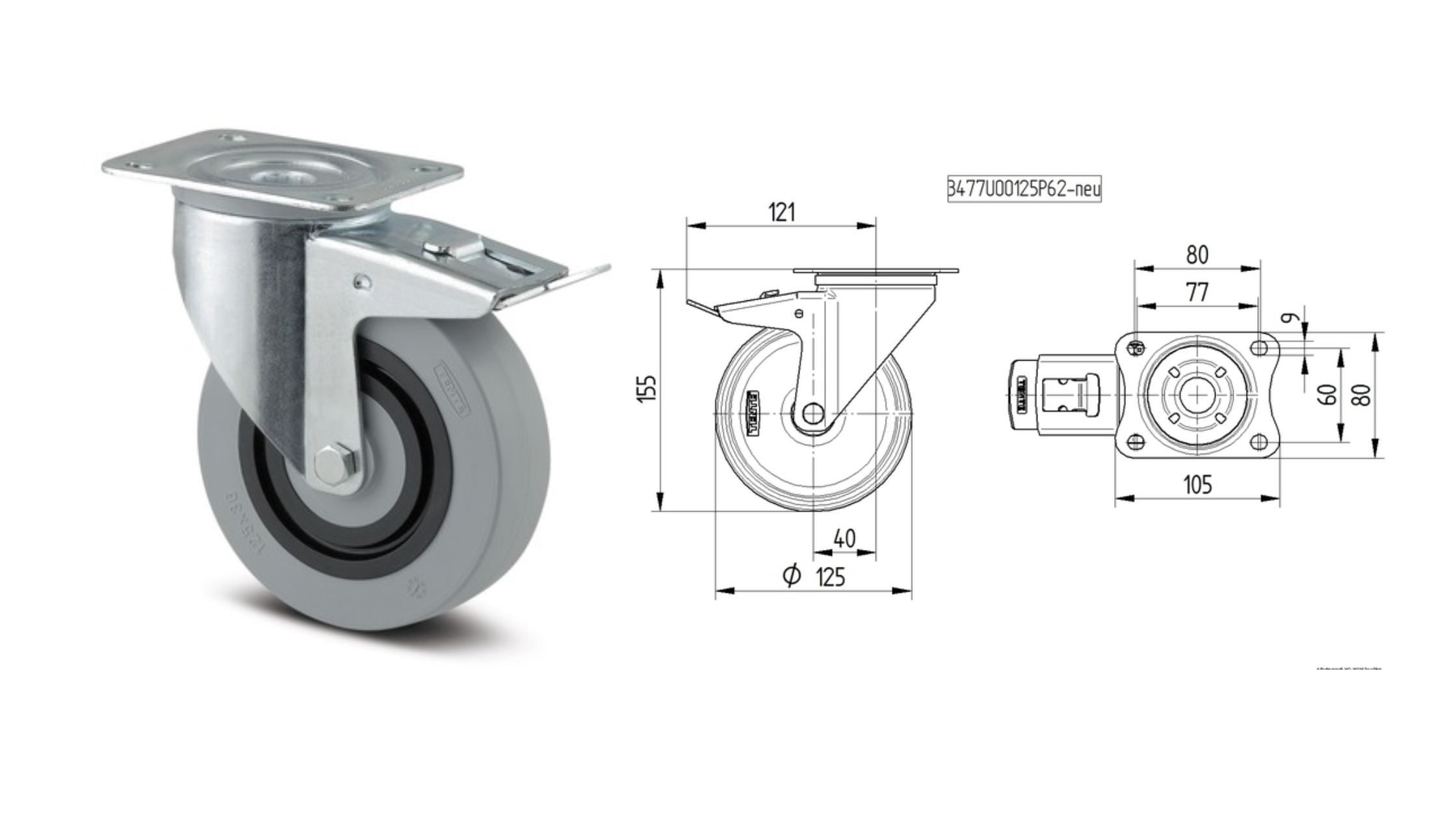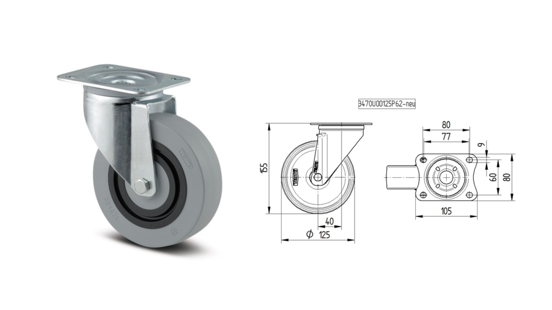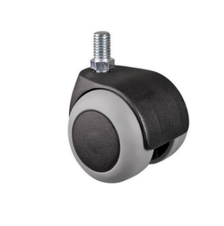 Roda giratória, estrutura de Polipropileno, espiga de rosca com aperto pescoço hexagonal. Núcleo da roda de Polipropileno. Superfície de rodagem TENTEprene (borracha termoplástica), cinzenta, não deixa marca, casquilho liso.