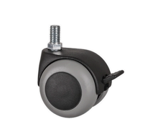 Roda giratória com travão na roda, Estrutura de Polipropileno, espiga de rosca com aperto pescoço hexagonal . Núcleo da roda de Polipropileno. Superfície de rodagem TENTEprene (borracha termoplástica), cinzenta, não deixa marca, casquilho liso.