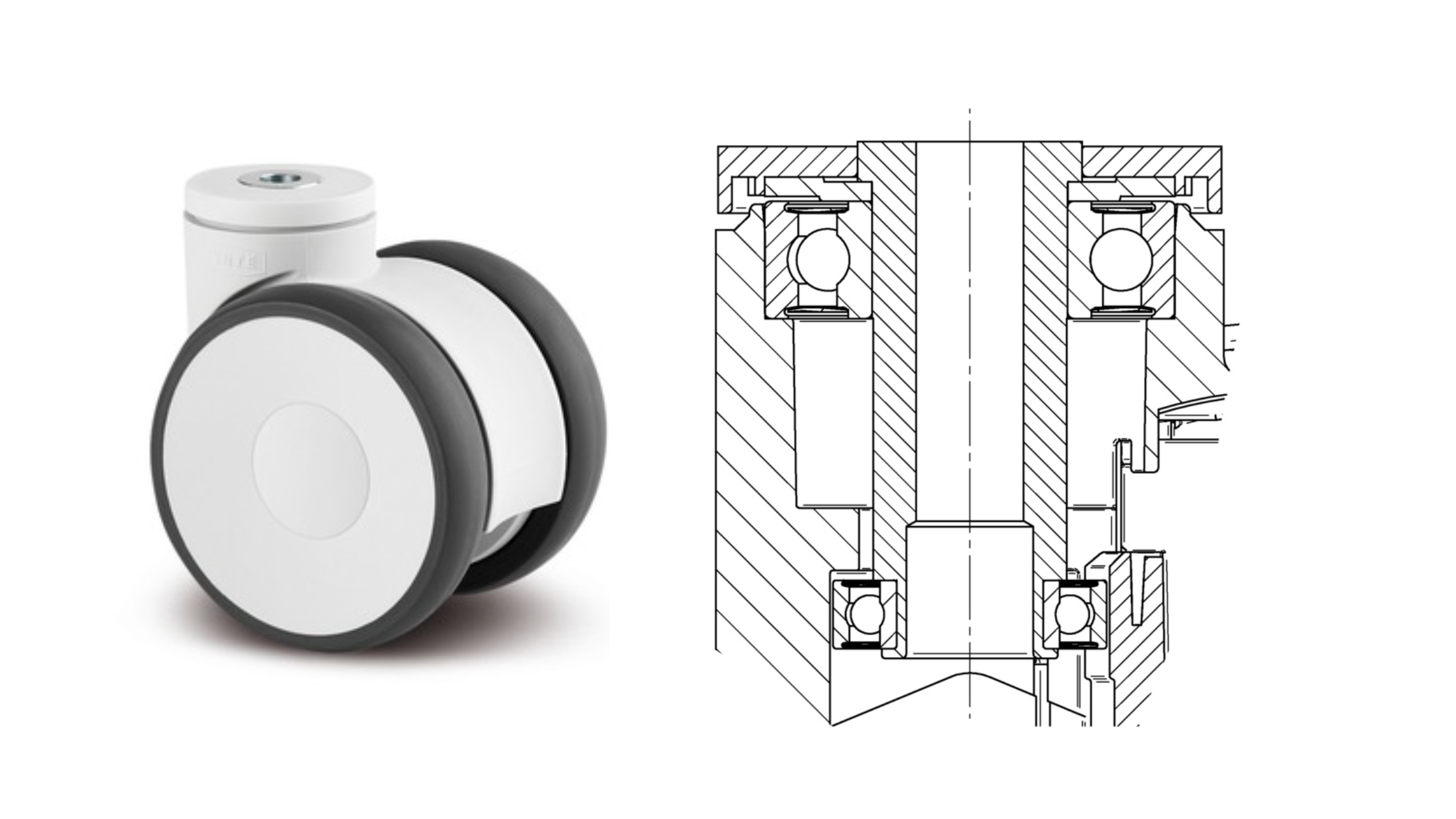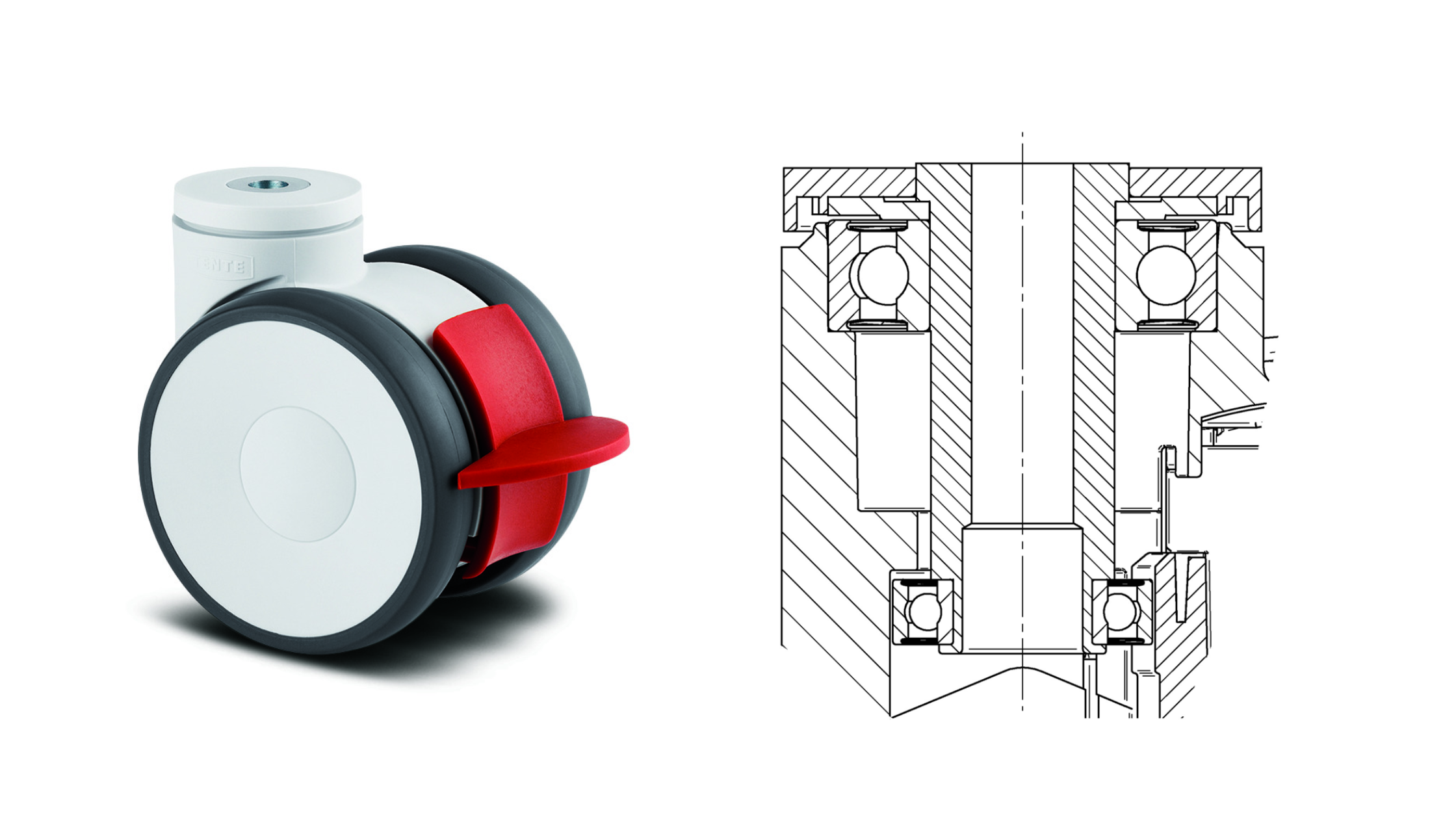 Roda híbrida “SYNTECH", núcleo da roda e superfície de rodagem de poliamida, com o centro em borracha dura elástica, redutora de ruídos, rolamento de agulhas.