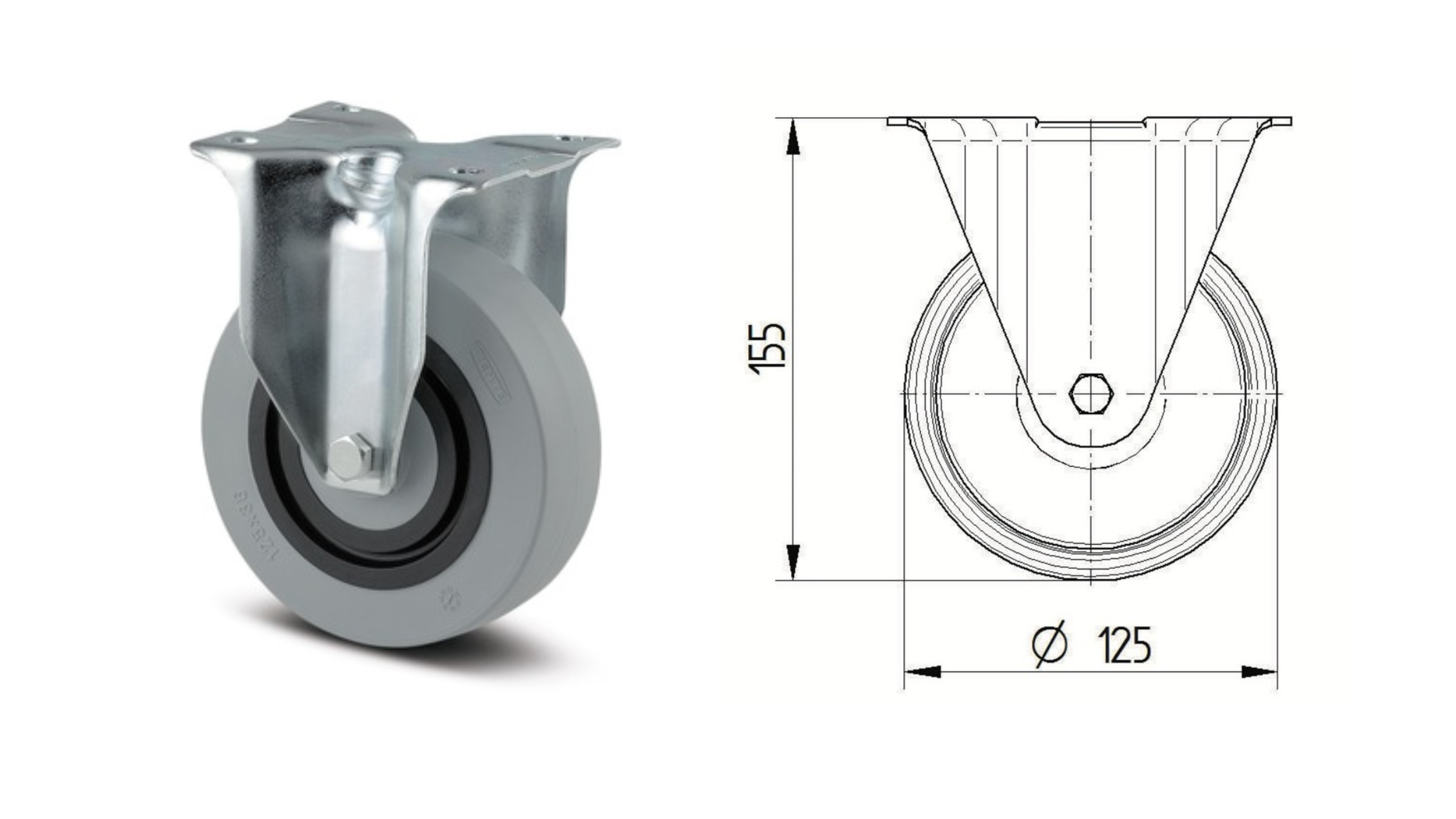 Roda fixa, forquilha de aço prensado, zincado, cromado a azul, eixo da roda aparafusado, Suporte de fixação.